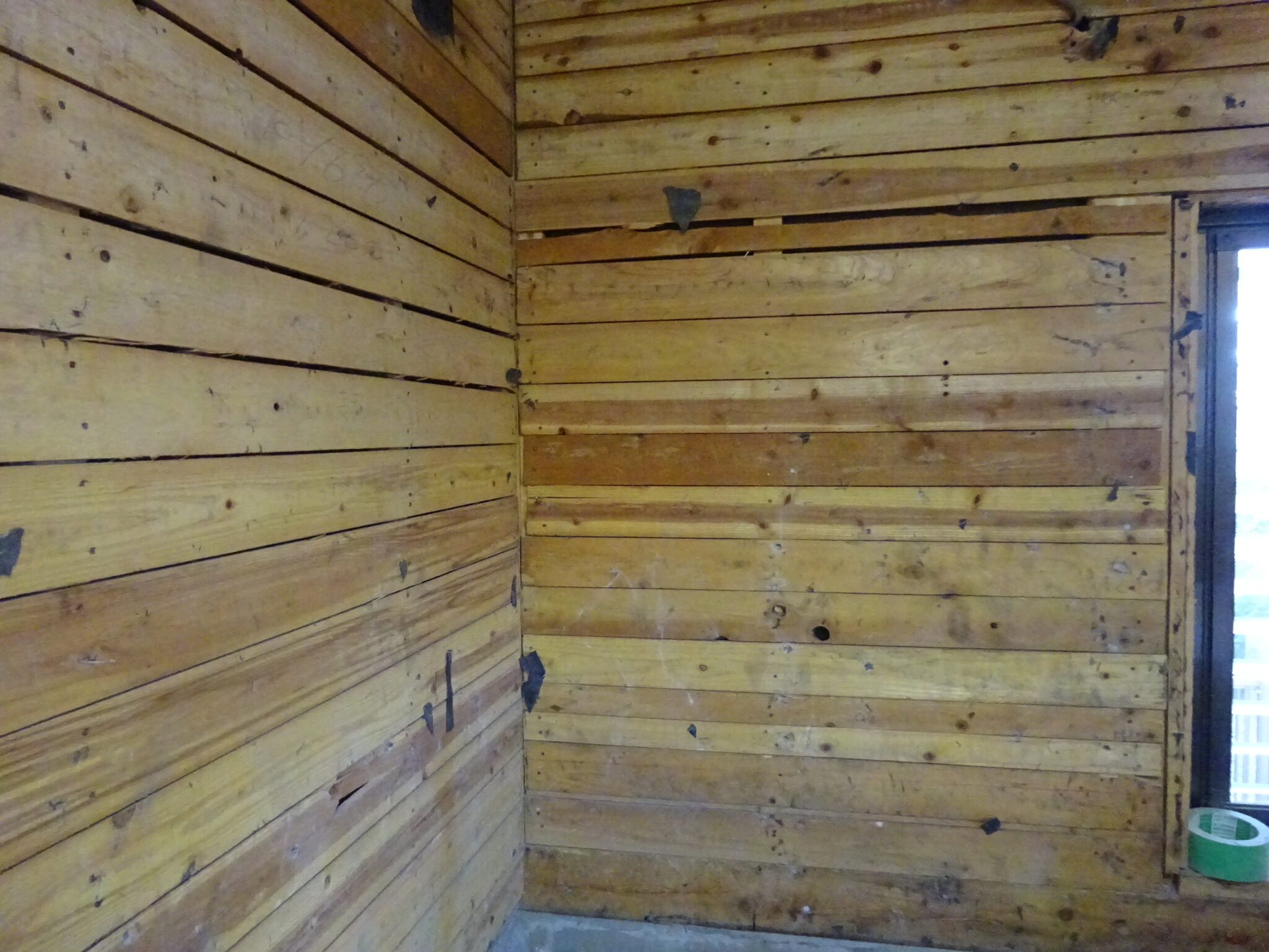 壁面タイル下地のキズリになります。今回はキズリは取らなくても新しいシステムバスは入るので無理には解体しません。内部の土壁が落ちてこないように配慮します。