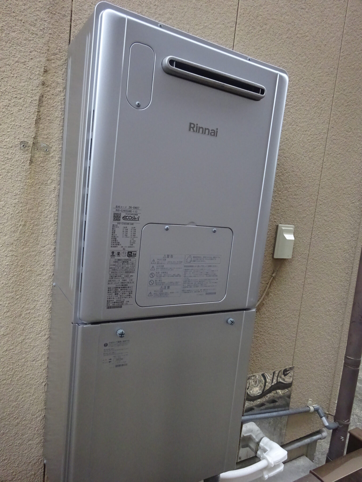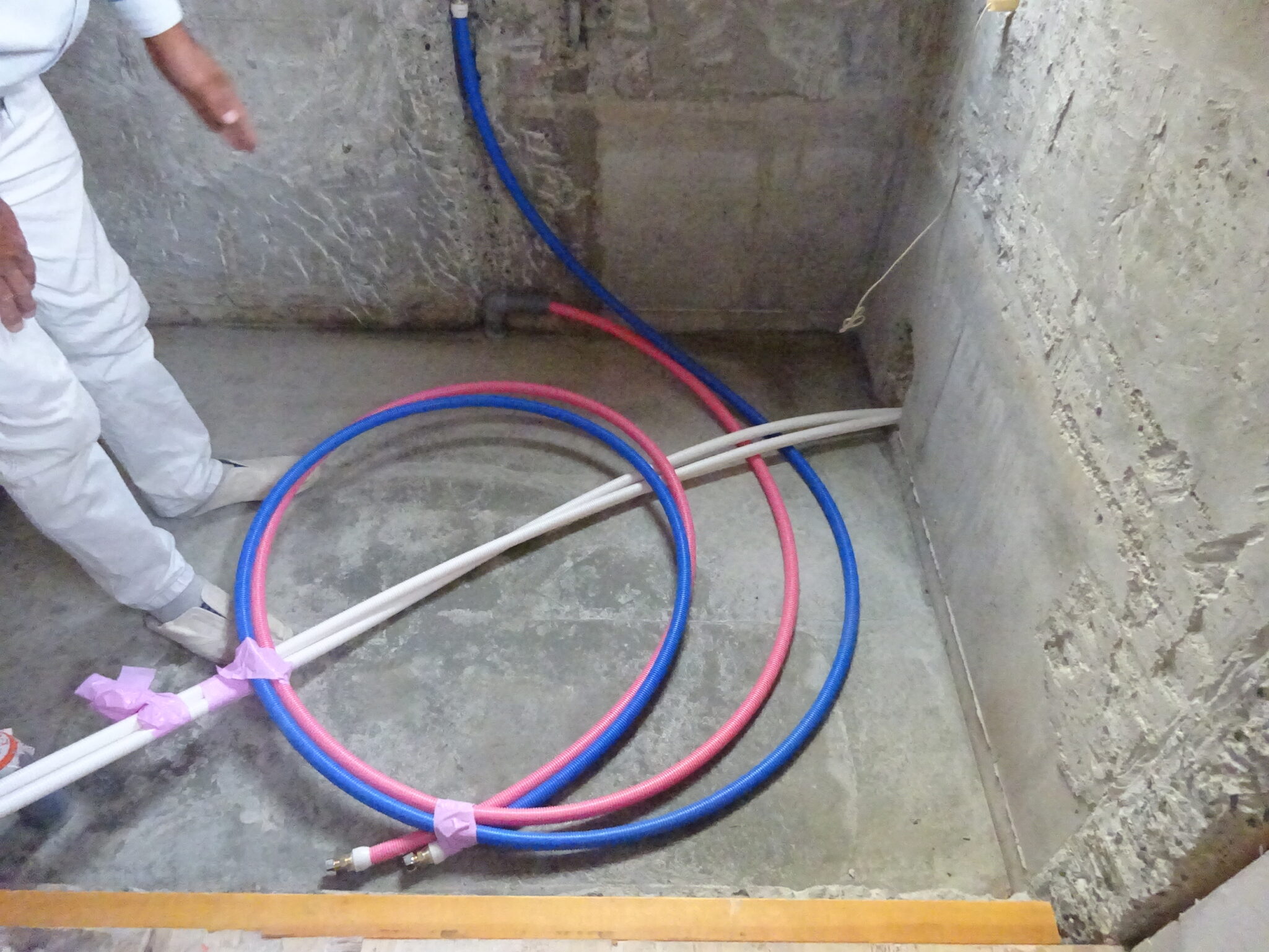 青い管が給水管、ピンクの管が給湯管、白い管が追炊き管の往き戻りになります。