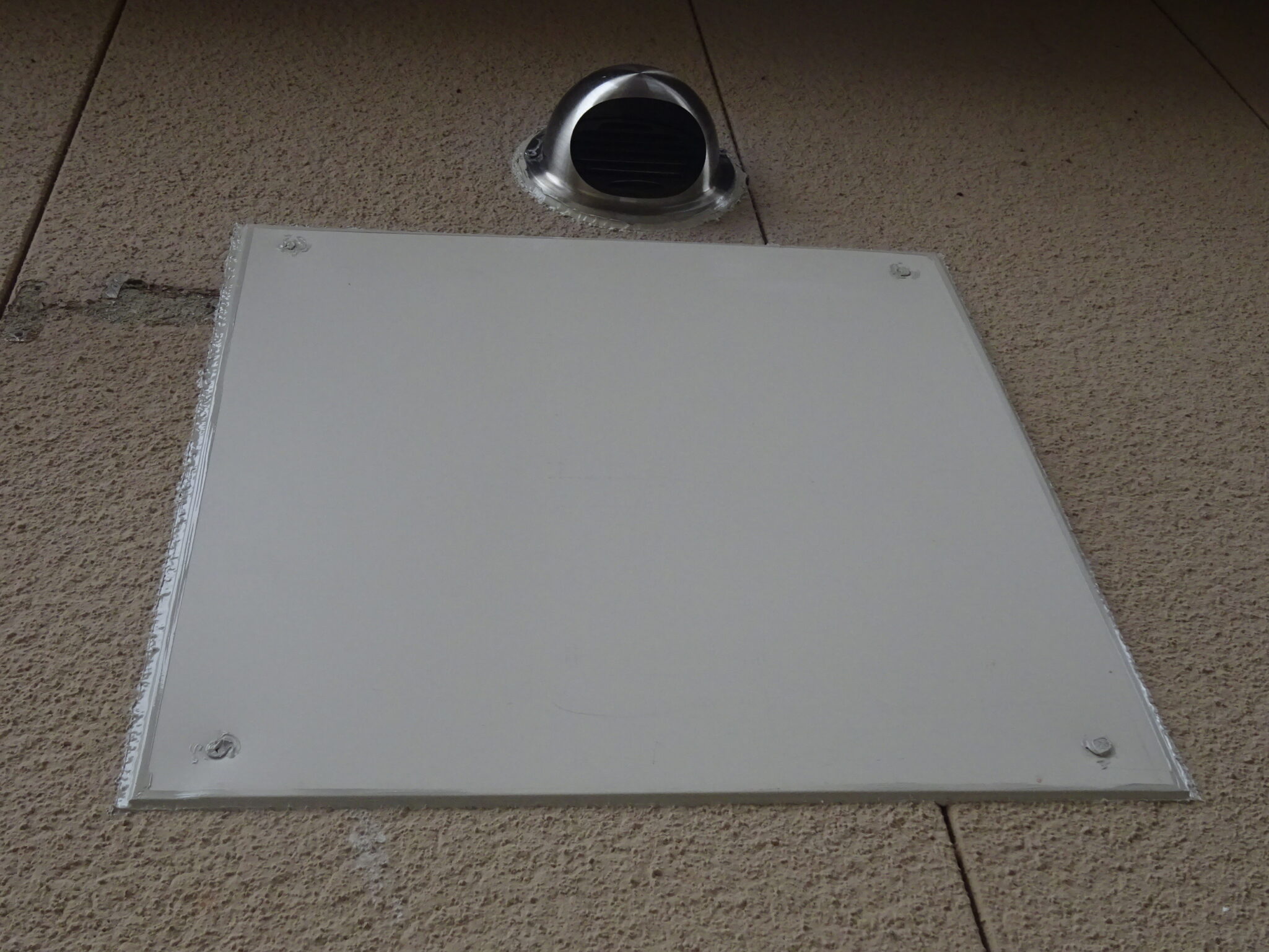 以前の浴室換気乾燥暖房機が取り付けられていた配管部の開口を板金平板で塞ぎます。