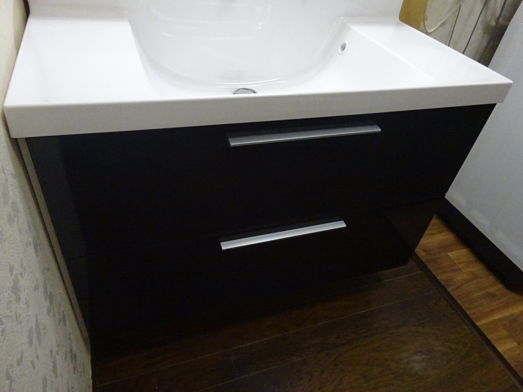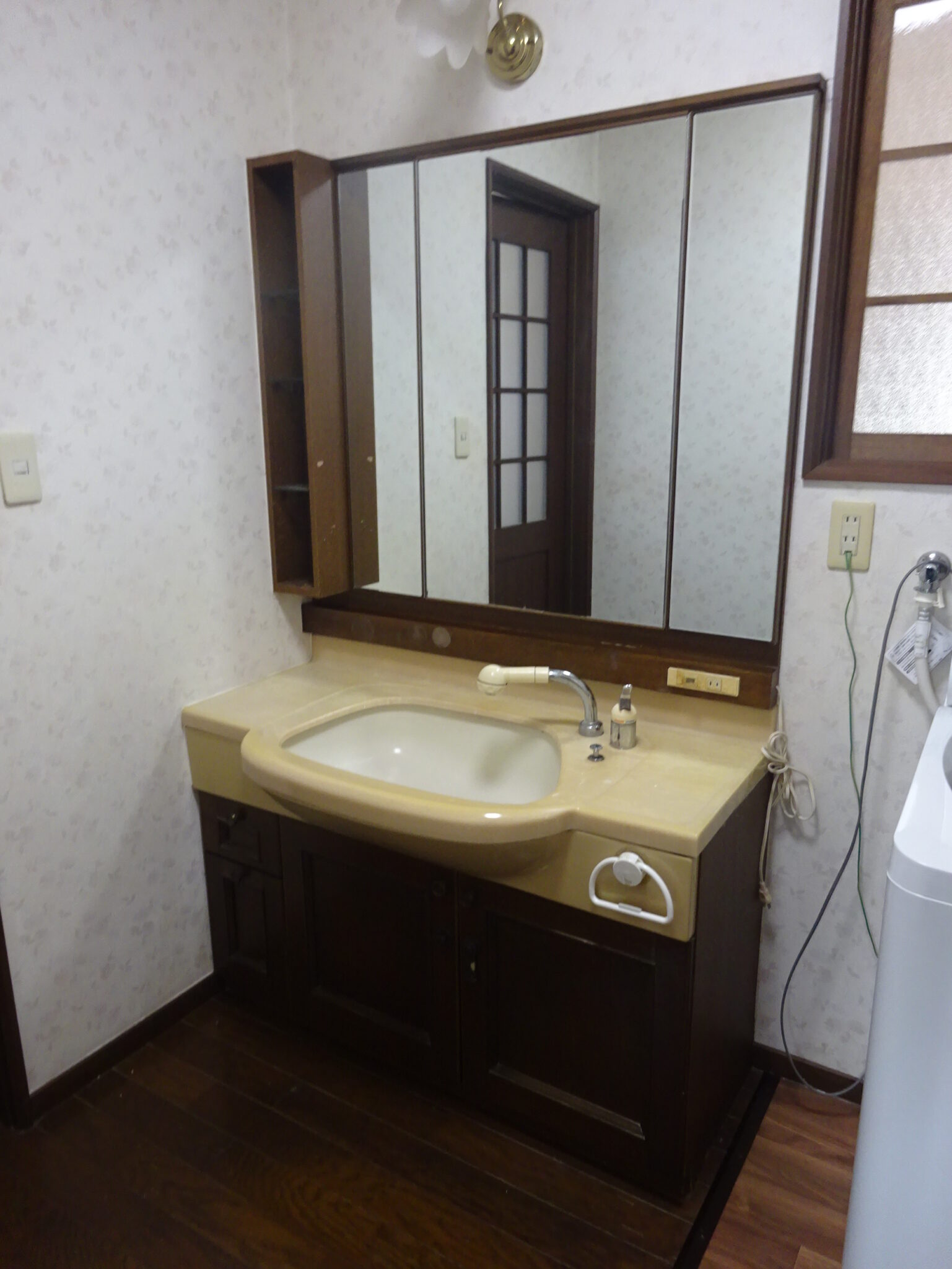 施工前の既設の洗面化粧台です。 間口が1150㎜ほどありましたので大きいサイズの洗面化粧台でした。数センチほどボウルの位置が低くて少し使いづらかったそうです。